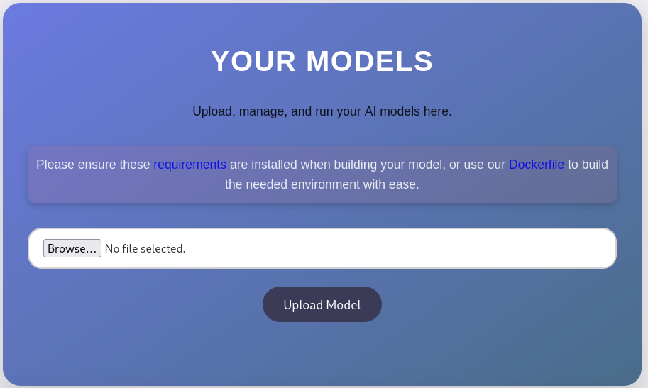 After I am logged in as an authenticated user I have the option to upload a TensoreFlow model for the server to validate/run. The website offers two ways of setting up the development environment for such a model, either through a Dockerfile or a requirements.txt.